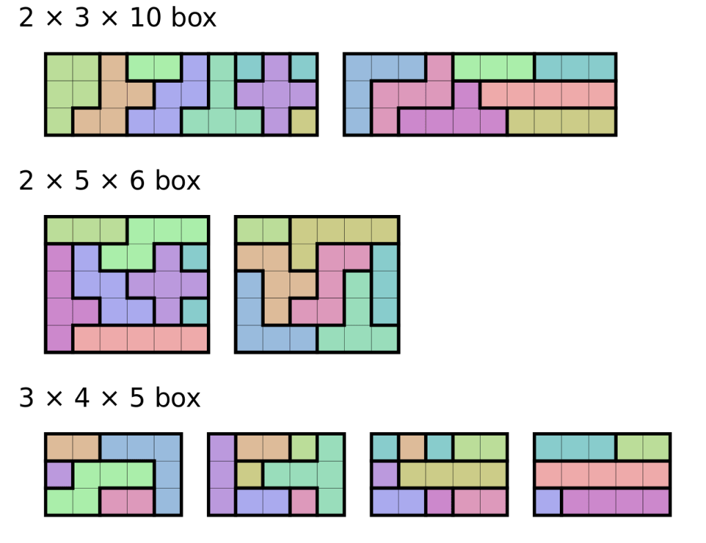 Un classico gioco è quello dei rettangoli: si consegnano ai bambini i 12 pentamini ritagliati e si chiede loro di completare uno a scelta tra questi rettangoli: